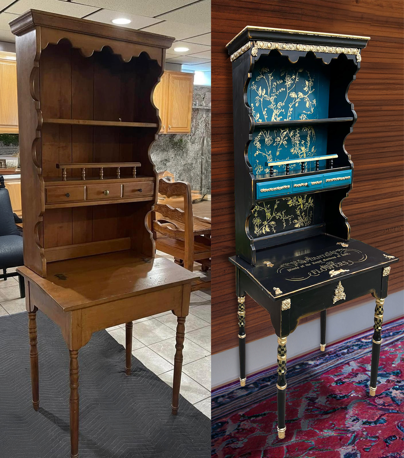 A beautifully hand-painted statement piece adorned with elegant gold leaf and sealed for lasting durability. This charming hutch, perfect for showcasing your treasured items, strikes elegance into the home.Unique and truly one of a kind, this piece elevated the Client's living space, adding a touch of whimsicality and sophistication.